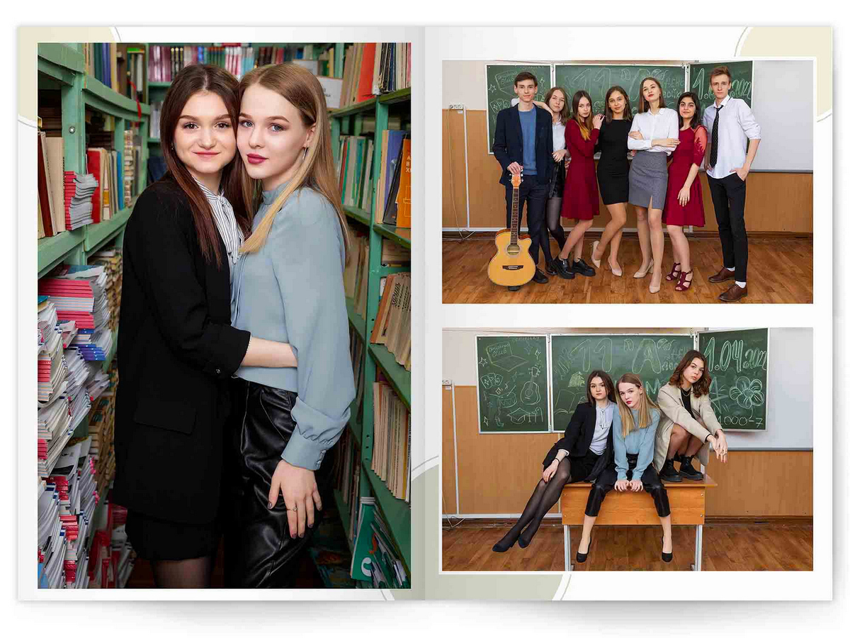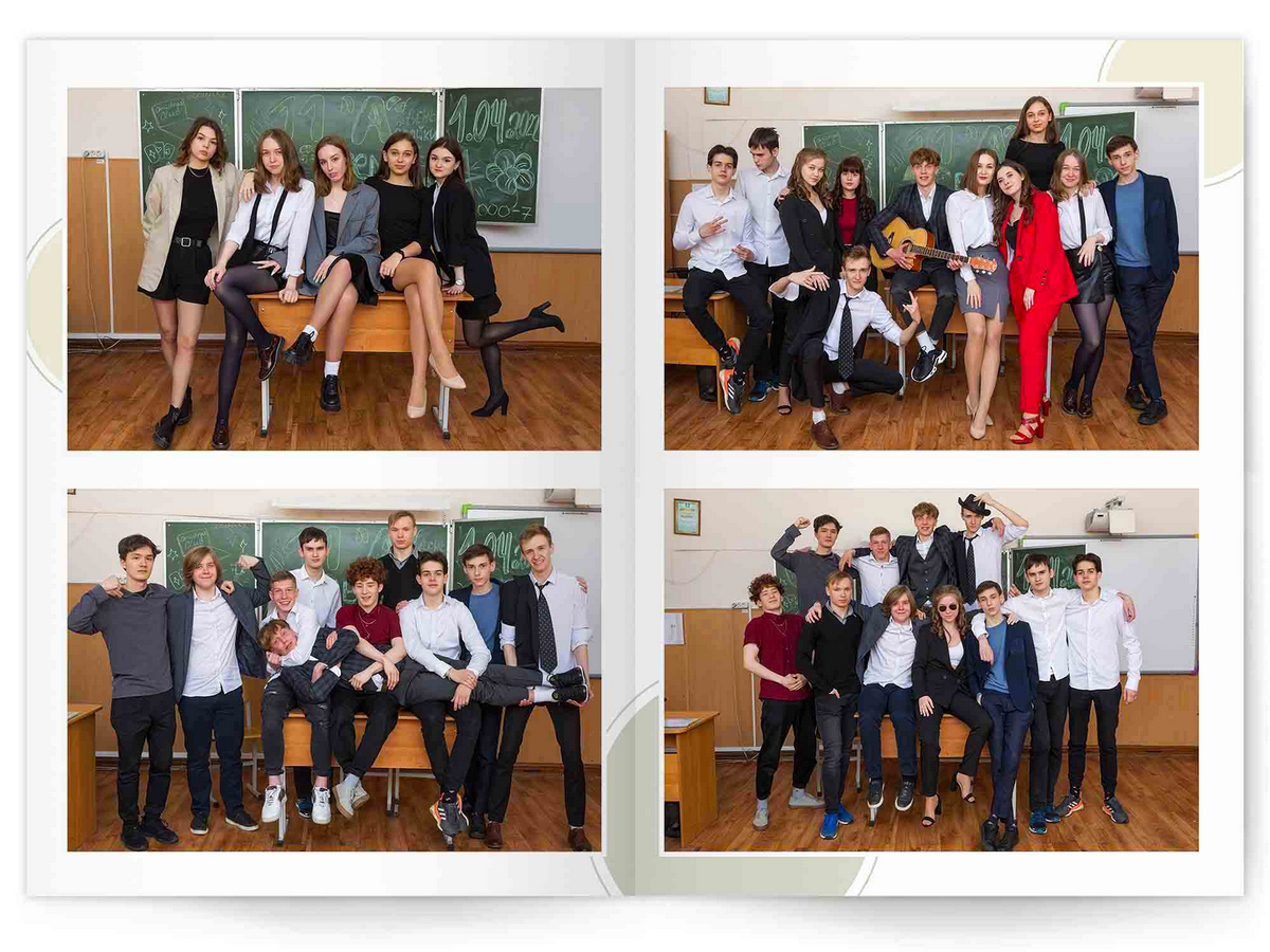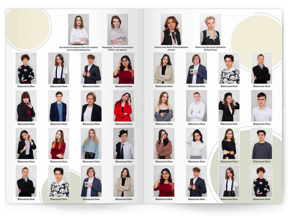 • Портреты всех одноклассников и классного руководителя на развороте или второй портрет на всю страницу слева, справа портреты всех одноклассников и классного руководителя