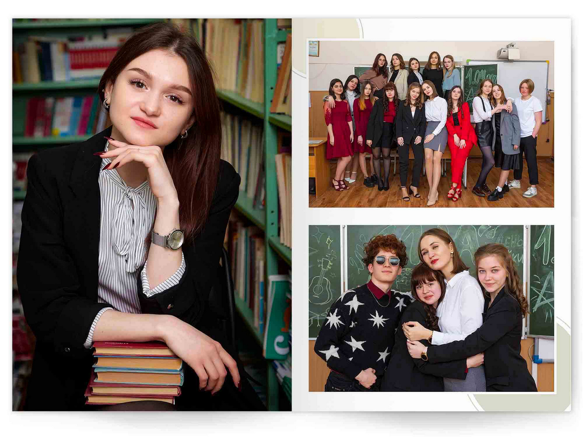 • Можно добавить общее фото всего класса на второй разворот +350 ₽ (будет альбом на 2 разворота)