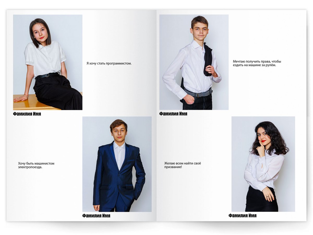 • Портреты всех одноклассников и все учителя, которые придут на съёмку на развороте